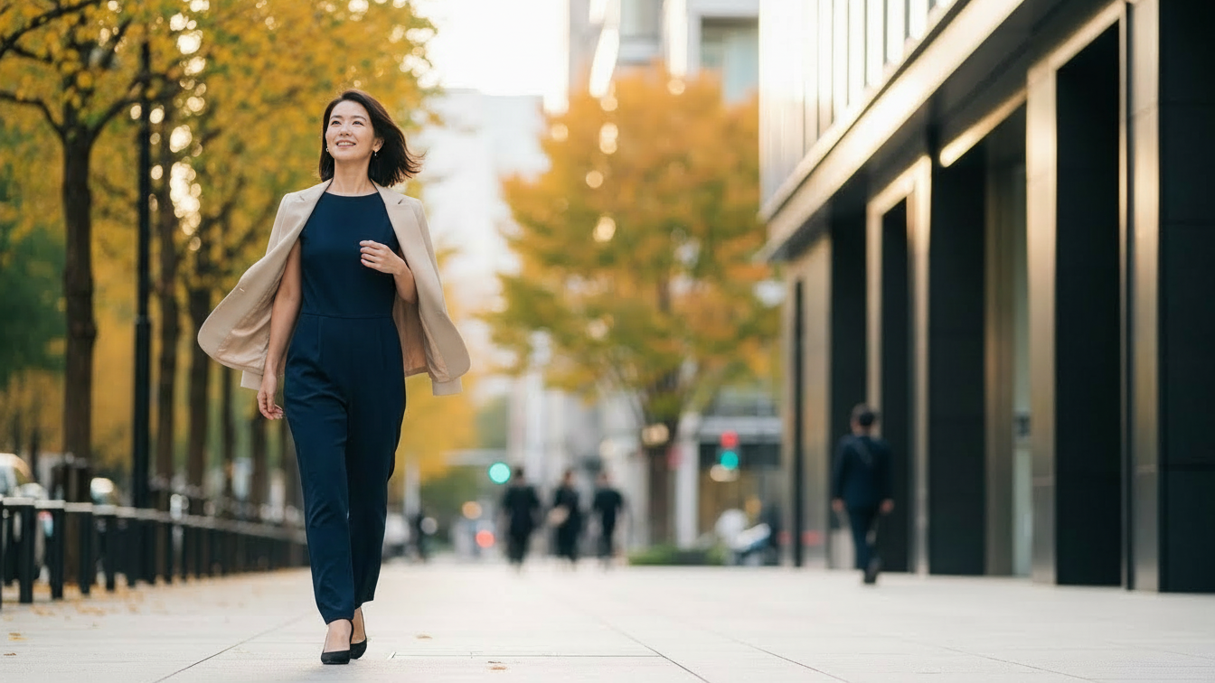 実は、オールインワンは40代にこそおすすめしたいアイテムなんです!1枚でコーディネートが完成するから、忙しい朝も時短できて、おしゃれに見えるのが魅力♪